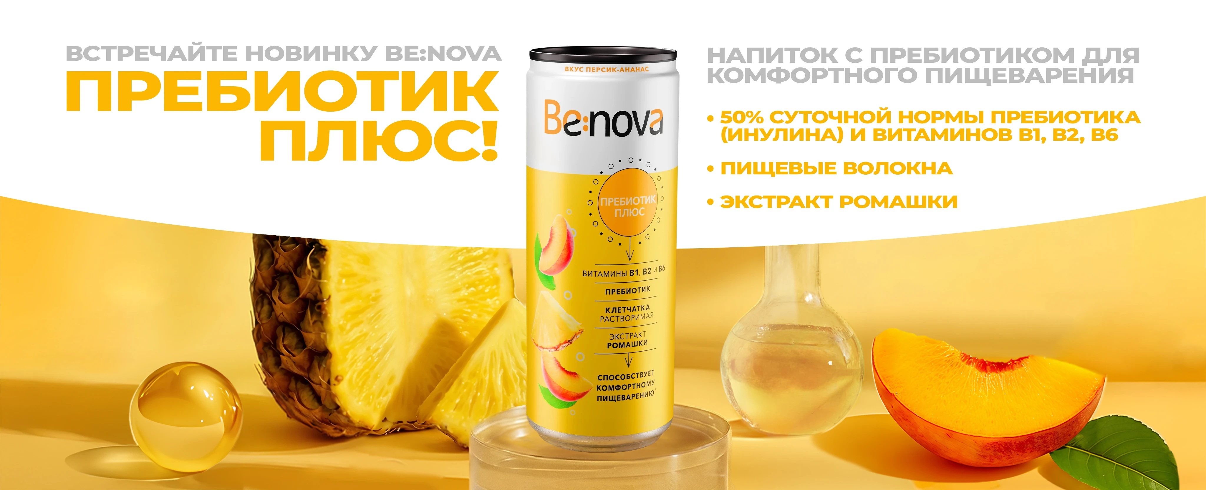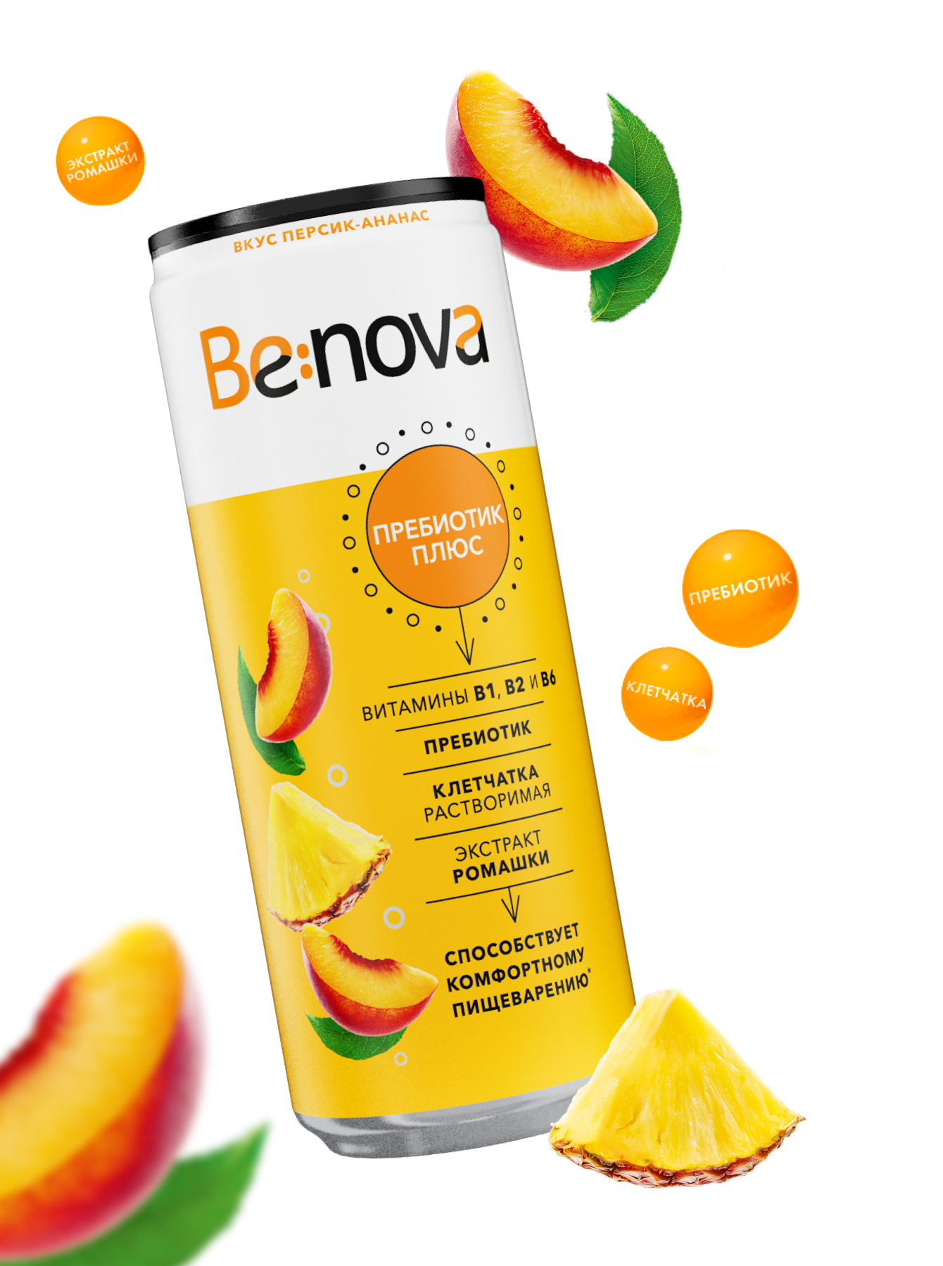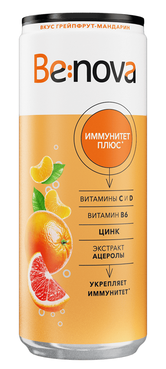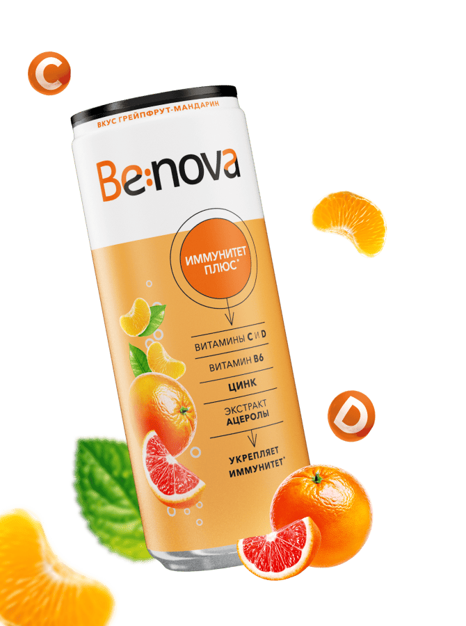 Каждая банка напитка Be:nova Иммунитет Плюс содержит 50% рекомендуемой суточной нормы потребления витаминов В6, С, D и цинка. Оптимальным выбором будет включить в рацион две баночки в течение дня.