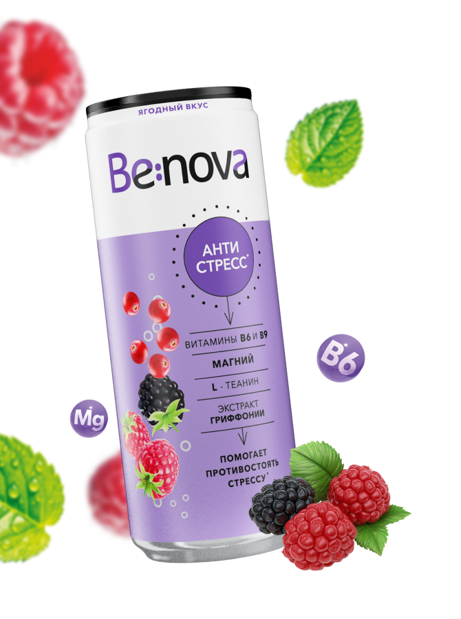 Каждая банка напитка Be:nova Анти Стресс содержит 50% рекомендуемой суточной нормы потребления витаминов В6, В9 и магния. Оптимальным выбором будет включить в рацион две баночки в течение дня.